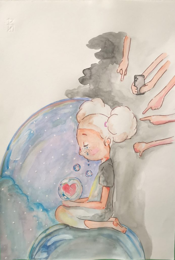 L’elaborato raffigura un cuore inserito in una lacrima che esprime la negazione delle buone relazioni a causa del bullismo subito dalla ragazza, che racchiude la sua sofferenza di vittima nelle proprie lacrime.