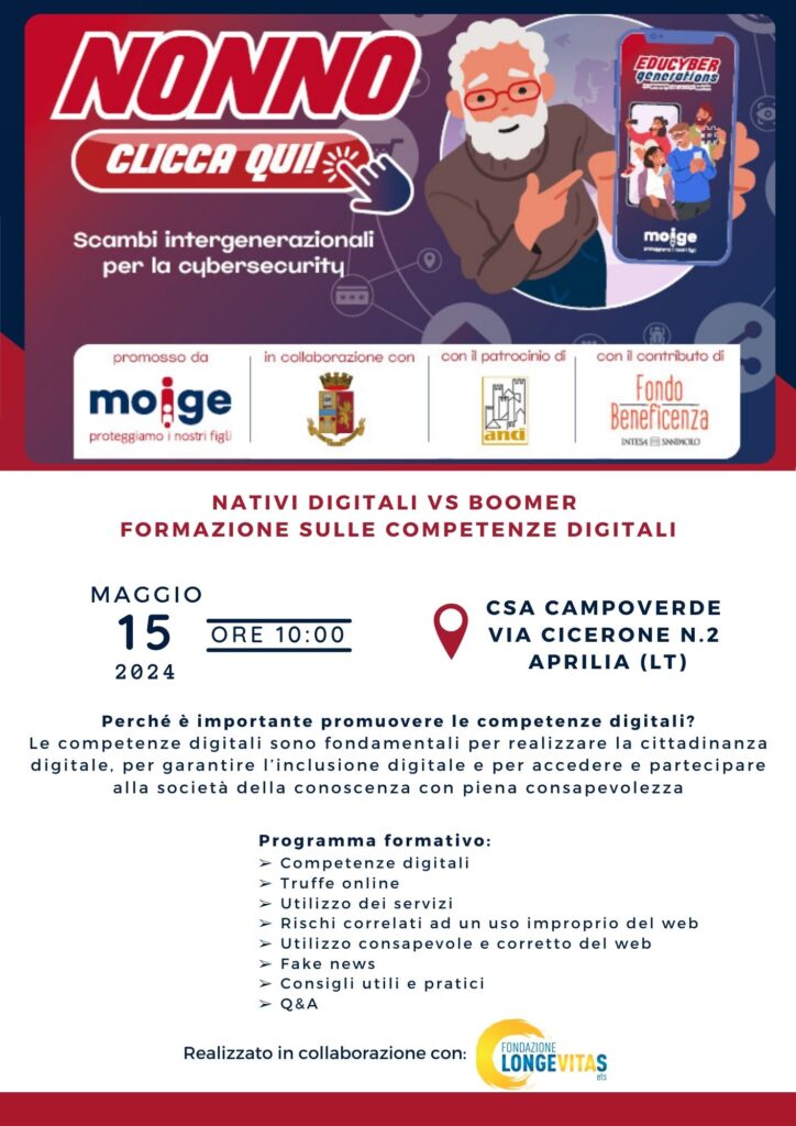16 Maggio 2024 Parte da Aprilia il tour nei centri anziani di “Nonno clicca qui” e più precisamente dal CSA Campoverde; alle ore 10 del 15 maggio il centro aprirà le porte ai nonni e ai nipoti per avviare un dialogo fra giovani e anziani sul tema dell’educazione tecnologica. I nonni saranno, quindi, invitati ad imparare ad utilizzare gli strumenti e i device più moderni e a navigare sul web, grazie alle lezioni impartite dai loro nipoti. Saranno 20 le tappe del tour realizzate nei centri anziani in collaborazione con la Fondazione Longevitas ETS, un momento unico che si pone un duplice obiettivo, quello di avvicinare due generazioni agli antipodi con due modi diversi di comunicare, e di colmare un gap che nel nostro paese ha investito la fascia più adulta mai educata al digitale. Tale progetto nasce da alcuni sconcertanti dati: solo il 4,4% degli adulti tra i 65 e i 74 anni di età risulterebbe avere competenze digitali ed informatiche di base. Un numero paradossale se pensiamo che molti “over” a più di 65 anni ancora lavorano e utilizzano quotidianamente almeno un PC. Il progetto sta raggiungendo anche 80 Istituti dove saranno circa 4.000, i “nonni” coinvolti nel progetto, i “nipoti” saranno, invece, 1.600: tutti ragazzi provenienti da scuole secondarie di primo e secondo grado del territorio nazionale, i quali diventeranno veri e propri docenti, pronti ad insegnare ai nonni/alunni tutti i trucchi del mondo digital. I pro di questo progetto sono molteplici, dalle interazioni tra due generazioni purtroppo sempre più distanti, fino alla sensibilizzazione in tema di cyber sicurezza. Quest’ultima, infatti, sarà una delle principali tematiche dei webinar che parallelamente accompagneranno l’iniziativa, coinvolgendo docenti, genitori e ragazzi, per un totale stimato di circa 20.000 famiglie beneficiarie. Il progetto prevede un ciclo di incontri per ogni istituto selezionato, durante i quali verrà utilizzato il metodo learning by doing, con tante attività pratiche su diversi dispositivi (PC, tablet e smartphone), in modo tale da rendere autonomi i nonni di fronte a qualsiasi device. La formazione tratterà argomenti disparati, tra cui l’accesso e l’utilizzo di internet, il servizio di posta elettronica, la conoscenza e l’uso delle APP e l’accesso ai servizi della pubblica amministrazione tramite SPID. Nonno Clicca Qui è un progetto realizzato dal MOIGE, Movimento Italiano Genitori, in collaborazione con Polizia di Stato, Anci – Associazione Nazionale Comuni Italiani e con il contributo del Fondo di Beneficenza ed opere di carattere sociale e culturale di Intesa Sanpaolo. Condividi l'articolo su