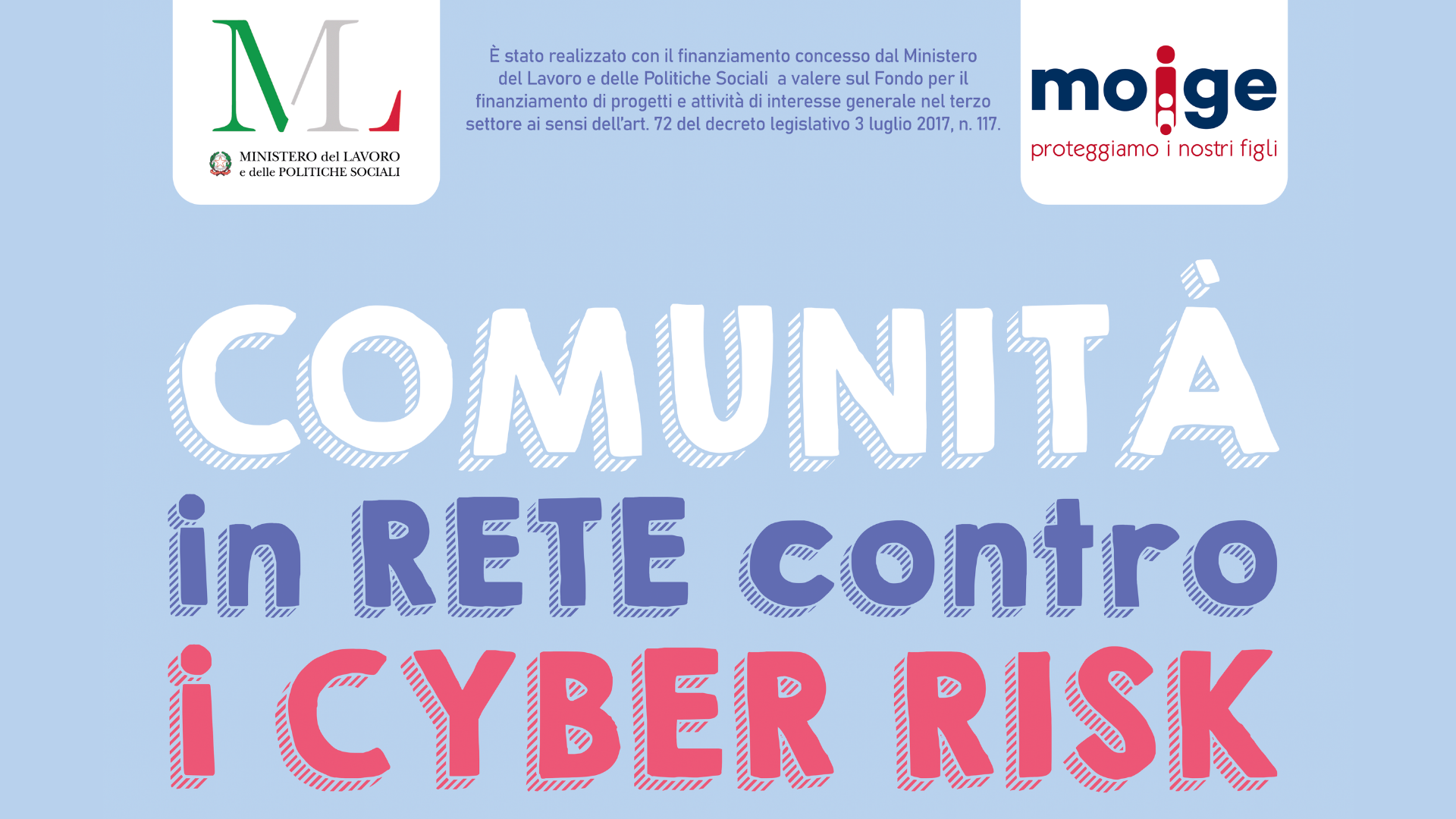 “Comunità in rete contro i cyber risk” nasce da un’iniziativa del Moige, finanziata del Ministero del Lavoro e delle Politiche sociali, e ha come obiettivo quello di prevenire e contrastare forme di violenza, discriminazione e intolleranza, con particolare riferimento al fenomeno dei cyber risk e della cyber security.