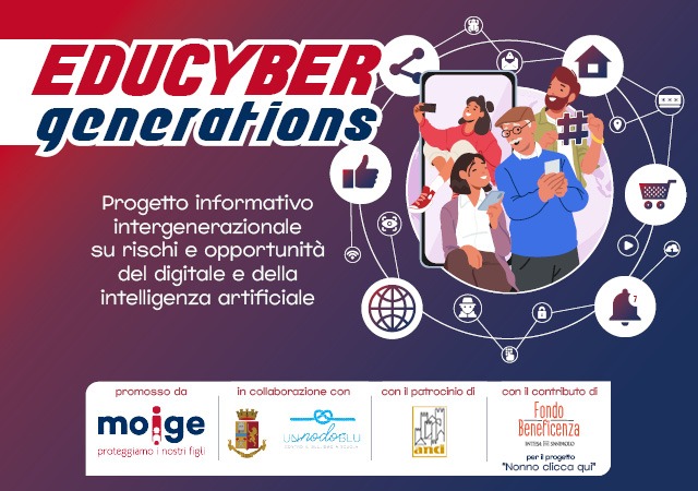 Educyber Generations è un progetto quadro sul tema del digitale realizzato insieme alla Polizia di Stato, ANCI, Nodo Blu del MIUR, con il contributo del Fondo di Beneficienza Intesa Sanpaolo per “Nonno Clicca qui!” che rappresenta il pilastro della categoria sociale “anziani”.